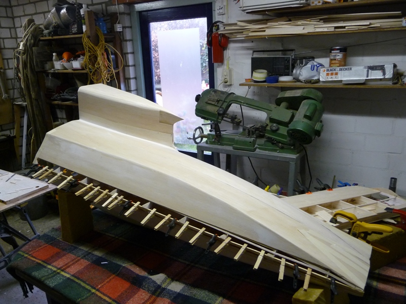 De achterromp delen zijn voor 95% beplankt en worden nu aan elkaar gelijmd (zoals zo'n plastic Ravell modelletje).