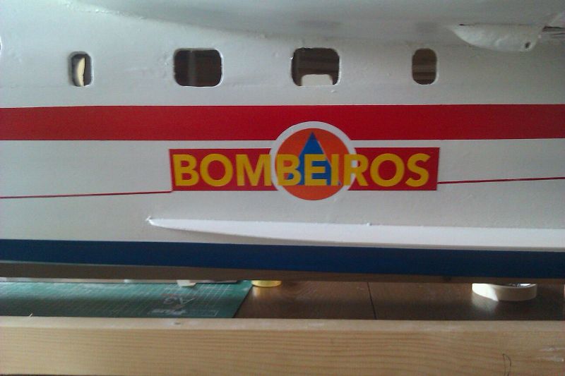 Het logo van de Portugeesche brandweer op de romp, de gele letters een sticker, de rest gespoten.