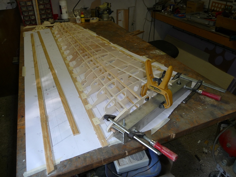 De stuurboord vleugel nog helemaal onbekleed en vast aan de werktafel.