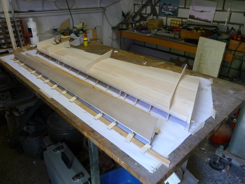De stuurboord vleugel nog helemaal aan de bovenzijde ingedekt (bekleed met 2mm balsa) en vast aan de werktafel.