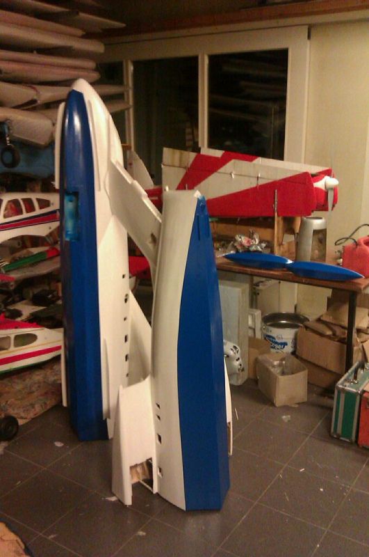De bodem van de romp is nu ook donker blauw gespoten, de wingfloaters (op de achtergrond) zijn ook blauw van onderen.
