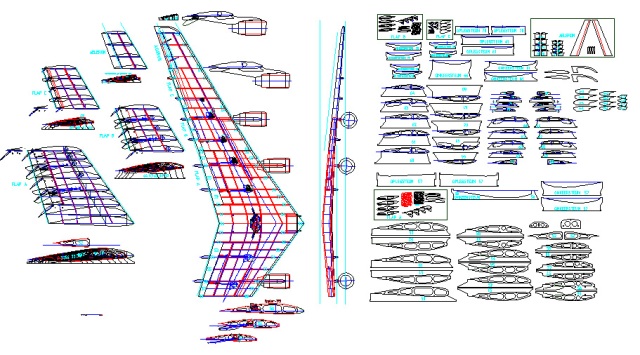De ontwerp tekening van de (3) vleugeldelen met flaps, rolroeren en motoren (An-01.dwg).