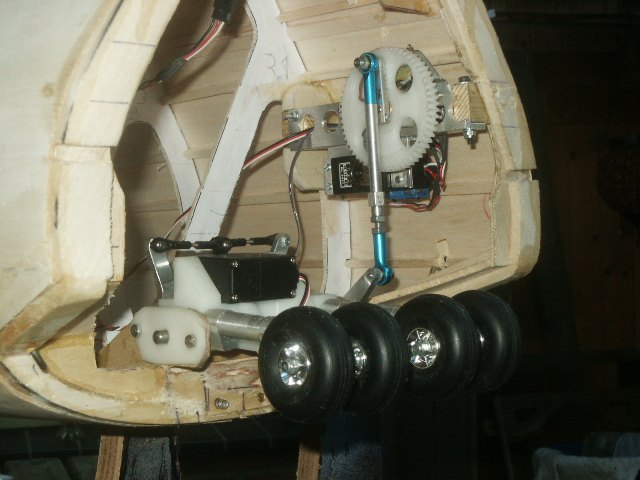 De intrekbare neuspoten (2x) met wielen, de stuurservo draait mee naar binnen.