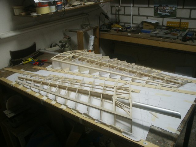 De beide vleugeltips worden tegelijk gefabriceerd, let op de aluminium verbindings buis.