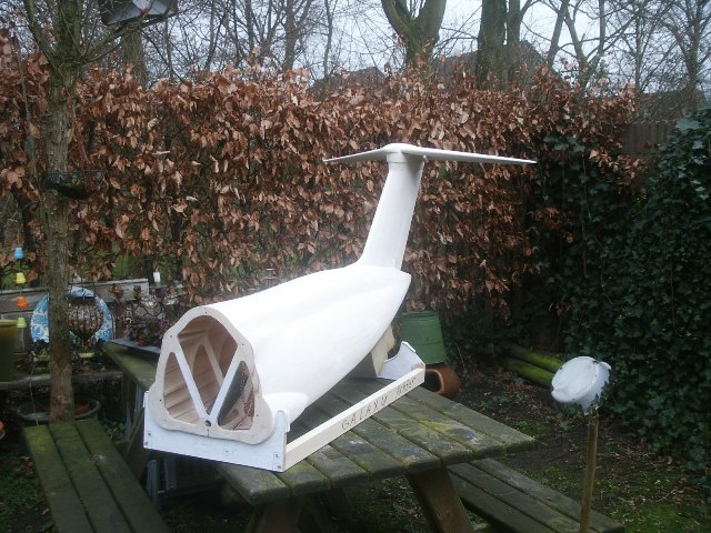 De achterromp kompleet met T-staart d.w.z. kielvlak met daar boven op het stabilo.