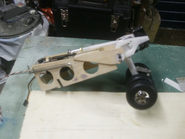Het neuswiel mechaniek met de wielen omlaag geklapt d.m.v. een 180° servo.